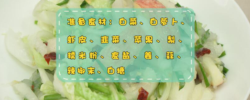 准备食材:白菜、白萝卜、虾皮、韭菜、苹果、梨、糯米粉、食盐、姜、蒜、辣椒末、白糖。