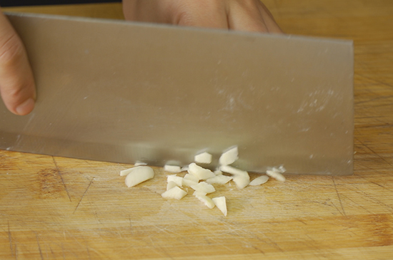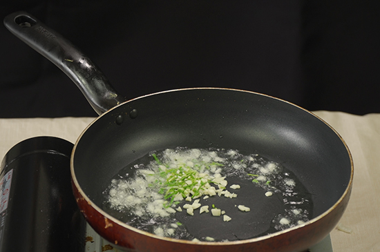 2、起锅烧油,油热后放入蒜末和葱花大火炒出香味,再放入切好的香菇翻炒至变软。
