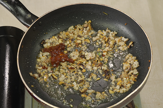 3、加入猪肉馅、料酒后,转小火不断翻炒至肉色变白,加入白糖搅拌均匀后,再加入黄豆酱继续翻炒。