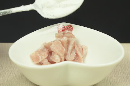 2、切好的肉丝和生粉、老抽、生抽抓匀后,腌制5分钟左右。