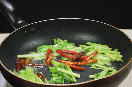 2、起锅烧油,油热后放入干辣椒、芹菜炒出香味。
