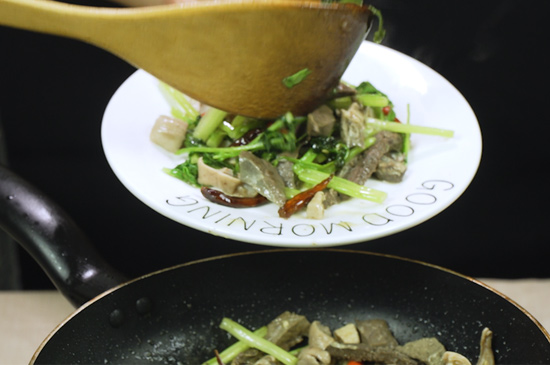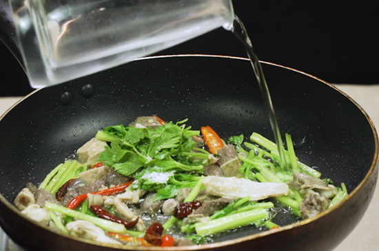 3、把小米椒、牛杂放入翻炒几分钟后,依次放入料酒、芹菜叶、盐、味精和适量水翻炒均匀。