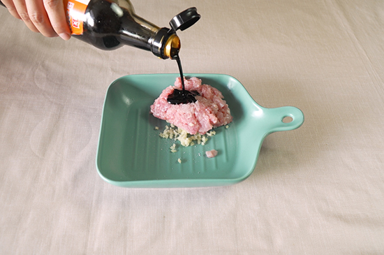 2、姜末、肉馅、盐和酱油混合搅拌均匀后,放在一旁晾置10分钟左右。同时将水和面粉和成面团,和好后放在一旁醒面。