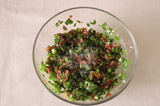 1、韭菜摘洗干净后,用手卡住韭菜使劲甩干水分并切成韭菜末。猪肉洗净后剁成肉泥,生姜切末备用。