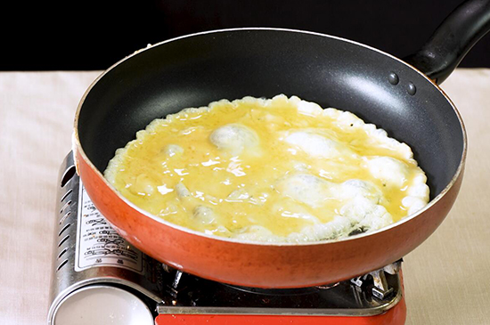 2、在油锅中放入少量的油,将搅匀的鸡蛋放锅里面先煎成大块鸡蛋,将其煎成金黄色起锅。