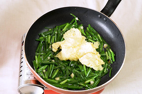 3、再在锅中放入油,将蒜头倒入其中爆香,再放入韭菜,大概5分钟后放入鸡蛋。