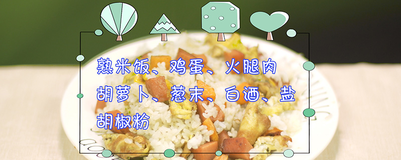 首先将火腿切成丁,鸡蛋打入碗里加盐、葱末后拌匀,将鸡蛋放入油锅中煎炸成金黄色,加入放入、葱末、胡萝卜、火腿翻炒均匀,再加入盐、胡椒粉拌匀,再放入米饭后翻炒就行了。