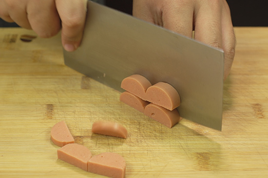 准备食材:熟米饭、鸡蛋、火腿肉、胡萝卜、葱末、白酒、盐、胡椒粉。