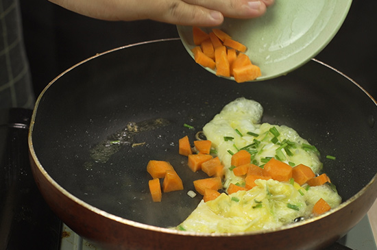 3、再放入、葱末、胡萝卜、火腿、翻炒均匀,再加入盐、胡椒粉拌匀。