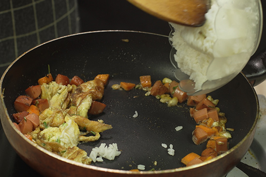 4、再加入隔夜的米饭迅速翻炒,这样就可以做成香味可口的扬州炒饭。