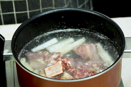 3、将排骨、山药捞出,排骨放入锅中,待排骨炖至5成熟,放入山药炖3小时,加入盐、味精和胡椒粉等调料,这样营养丰富的山药排骨汤就做成了。