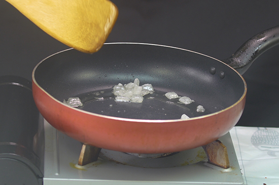 1、锅里倒入少许油加热,放入冰糖后小火翻炒,至冰糖融化出现糖色后,加入适量的清水,转至大火烧开
