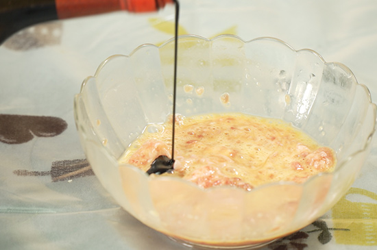 2、肉馅加入鸡蛋和清水顺时针搅匀,再加入老抽、料酒和盐拌匀。