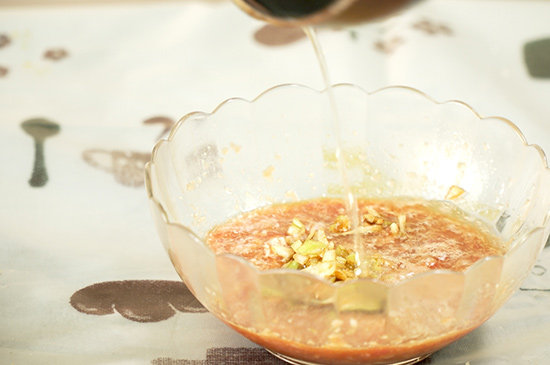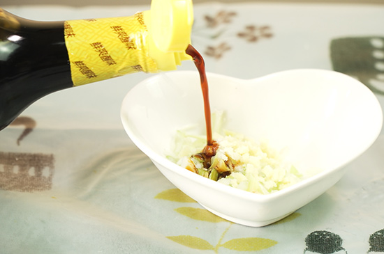 3、切好的葱末、姜末、盐、酱油和五香粉搅拌均匀,同时起锅烧油,油热后放入鲜花椒炸香,再取出花椒不要。