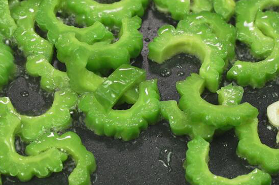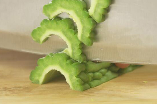 苦瓜去瓤切片后下锅焯水,辣椒切成末,打两个鸡蛋到碗中搅拌均匀,,再和五毫升食用油一起倒入锅中搅散再盛出,在锅中倒入焯过水的苦瓜和蒜片一起翻炒,再加入生抽、盐、料酒,最后加入鸡蛋和辣椒末翻炒均匀即可出锅。