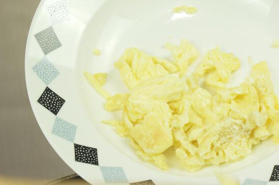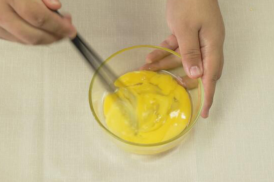 4、锅中加入五毫升食用油后倒入蛋液,搅散后盛出