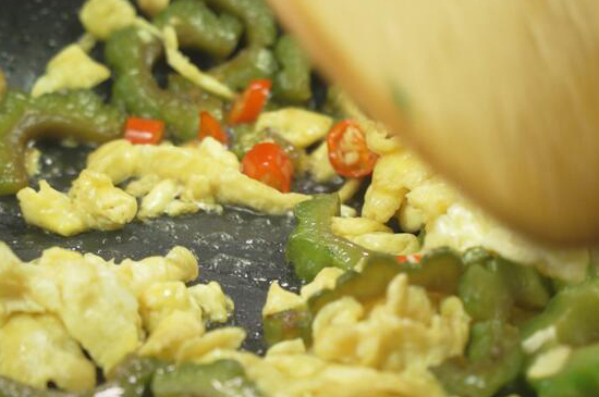 6、最后加入鸡蛋和辣椒末翻炒均匀,这样香辣可口的苦瓜就完成了。