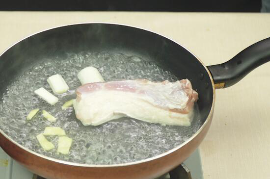 2、起锅大火烧开水后换小火,再把洗好的肉、葱和姜放入煮至9成熟,煮好后捞出,并且立即在肉的表面抹上老抽。
