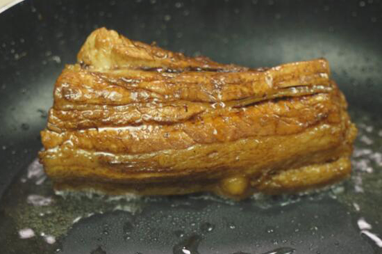 3、另起锅烧油至8成熟,将五花肉肉皮那面朝下下锅炸制。