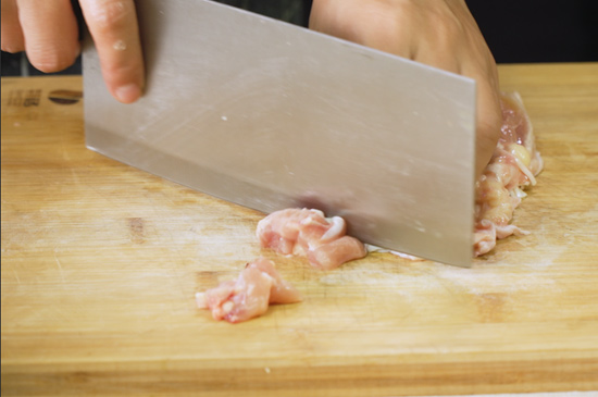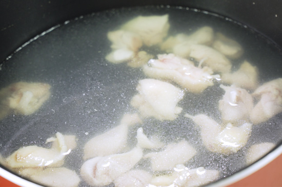 1、先将新鲜的鸡肉切块,放在热锅中浸泡半个小时左右,但注意用小火。