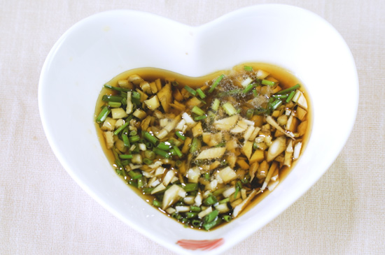 3、将葱、姜、蒜剁碎,放在碗里,加入香油、醋、盐、白糖、鸡精等,再加入浸过鸡的汤将其调均匀。