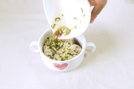 4、接着把鸡块取出,放入盘中,把调好的汁浇到鸡肉上,这样就可以做成鲜嫩可口的白斩鸡了。
