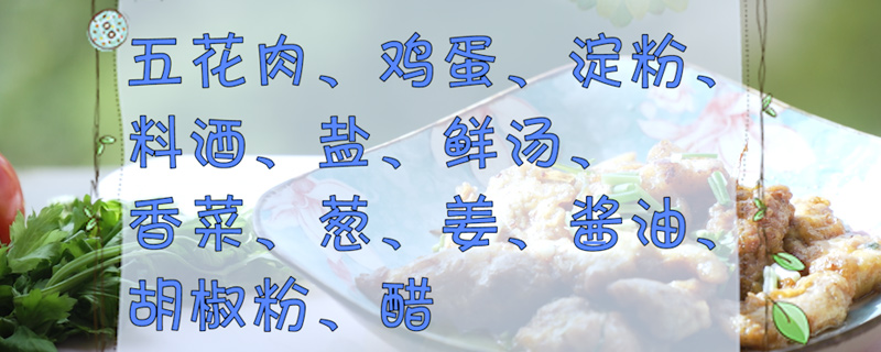 准备食材:五花肉、鸡蛋、淀粉、料酒、盐、鲜汤、香菜、葱、姜、酱油、胡椒粉、醋。