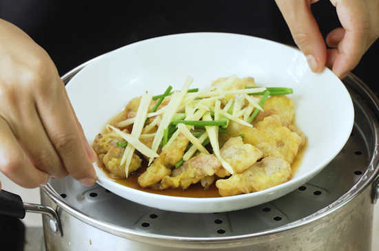 3、倒入盘中,加酱油、料酒、鲜汤、葱、姜丝后上蒸锅中蒸透,约20分钟取出。