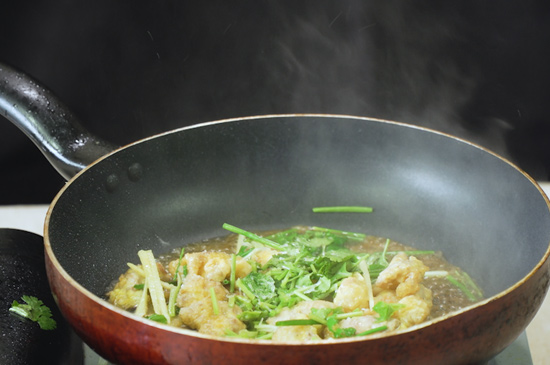 4、再放在油锅中加入盐、葱段和香菜、味精、醋、香油、胡椒粉等,就可以制成香酥可口的酥肉了。