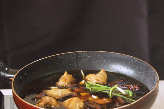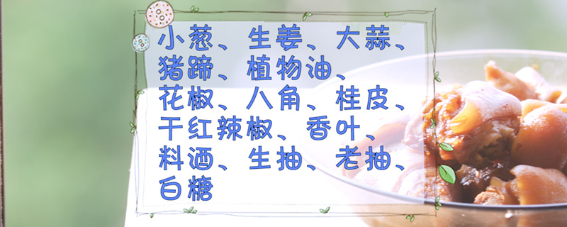 猪蹄倒入锅内,加入水、料酒、姜片烧开后捞出控干水分,再往锅内加入适量油,并依次加入花椒、八角、桂皮、干红辣椒、香叶不断翻炒,最后倒入猪蹄、料酒、生抽、老抽炒匀,加清水、葱结、姜片和蒜片小火炖1小时,再加盐和白糖大火收汁。