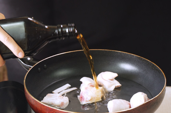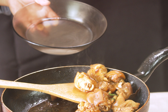4、倒入猪蹄、料酒、生抽、老抽翻炒均匀,加入适量清水、葱结、姜片、蒜片,转小火炖1个小时。