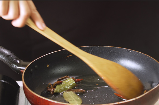 3、锅内加入适量油,倒入花椒,翻炒一段时间后将花椒捞出,依次放入八角、桂皮、干红辣椒、香叶炒出香味。