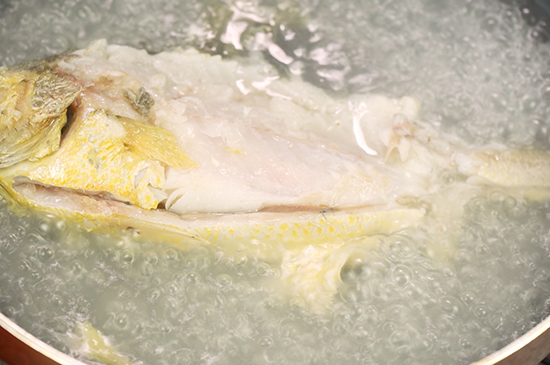 2、在锅中倒入适量的油,将黄花鱼放入锅中,待两面黄的时候取出鱼骨,鱼肉用生抽拌匀,鱼骨与清水熬成汤。