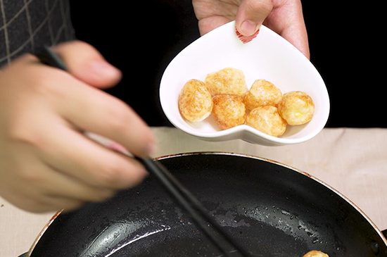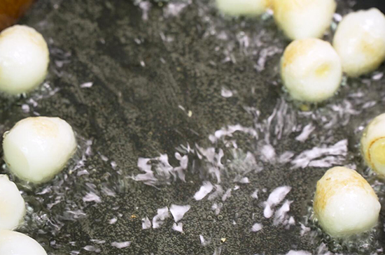 2、再将鹌鹑蛋的外壳去掉,起锅倒入适量的油,再将鹌鹑蛋放入锅中煎炸几下。