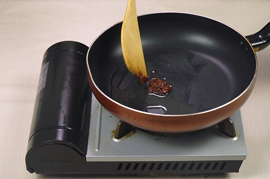 3、起锅烧油后倒入豆瓣酱炒香,再放入葱蒜末和辣椒末炒香。