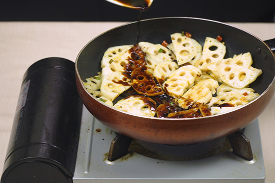 4、倒入藕片翻炒均匀后,把调制好的酱汁倒入再次翻炒均匀,一份美味的香辣藕片就做好了。