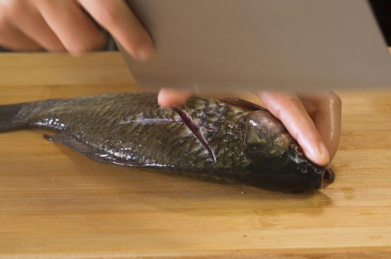 1、罗非鱼清洗干净擦干水分后,两面各用刀切出几道刀口,葱切段,姜切片,大蒜拍散。