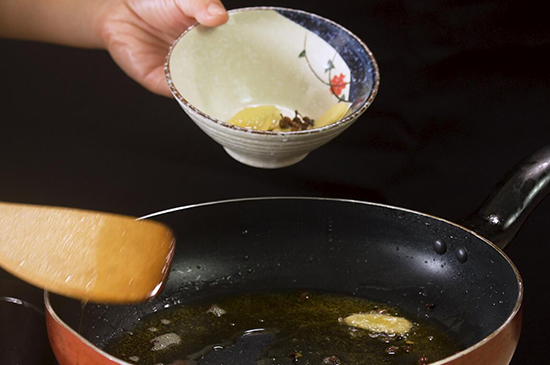 2、不粘锅内用姜片擦一遍,起锅烧油后放入姜片、花椒粒煎至变色捞出。