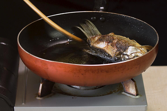 3、罗非鱼放于锅内静置一分钟,再转小火轻轻晃动锅,两面炸制金黄后推至锅内一边。