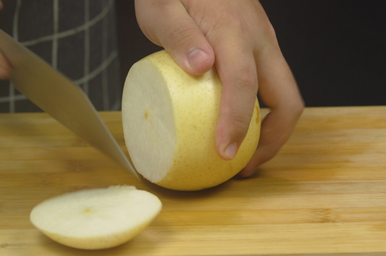 1、雪梨用清水清洗干净,顶部切开一块,用勺子挖空中间。