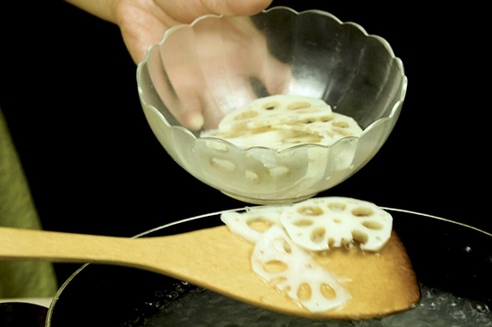 2、起锅烧水至沸腾,把藕片放入焯水2分钟后取出并用碗装好。