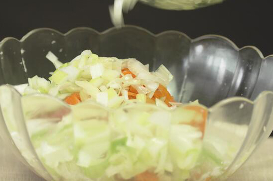 2、将胡萝卜切碎后,放入适量油和盐略微翻炒,再把胡萝卜放凉,加入牛肉馅内。