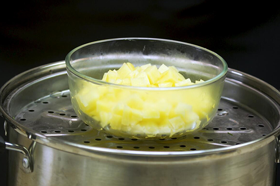 1、把土豆清洗干净去皮,切成小块后,离水蒸制软烂。玉米煮熟,火腿切丁备用。
