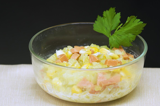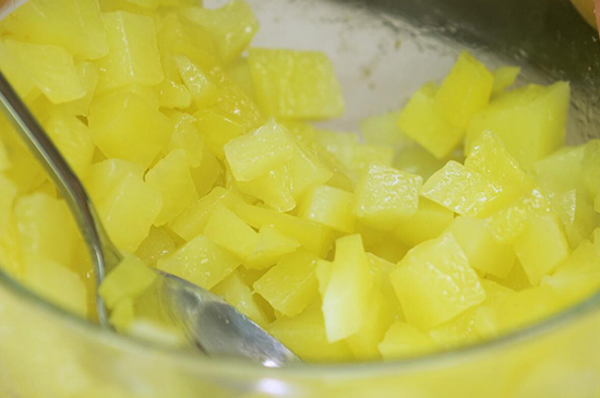 3、最后把玉米粒、火腿丁放入里面,用木铲搅拌均匀,美味的土豆泥就制作好了。