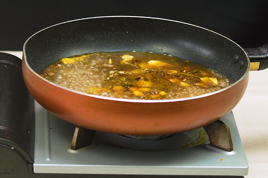 2、起锅烧油后,放入香葱、姜蒜片和花椒炒出香味,倒入豆瓣酱炒出红油后,加入适量的清水,把鸡精、盐、酱油和白糖倒入锅内调味。