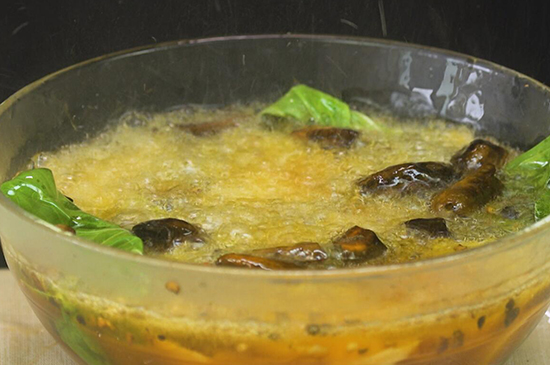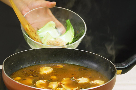 3、锅内汤汁烧好后,把腌制的鱼片放入锅内划开煮熟,之后捞出倒入装有青菜的碗底。另起锅烧热油并倒入干辣椒炒出红油。