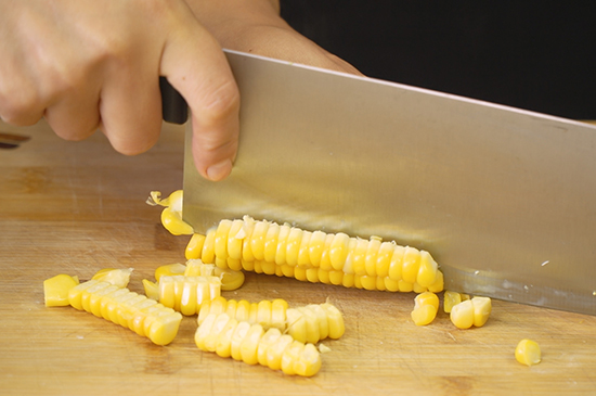 1、将甜玉米放锅中煮熟,取出后切下玉米籽备用。