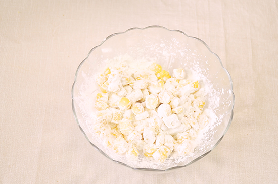 2、将玉米籽表面撒上干淀粉,并使每一粒玉米都包裹淀粉为佳,随后倒入适量清水。