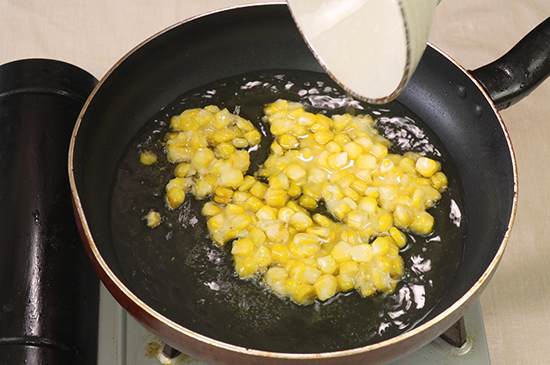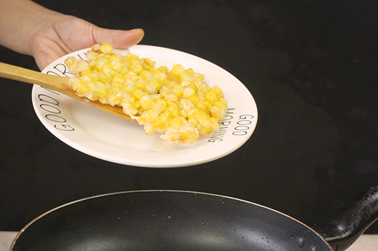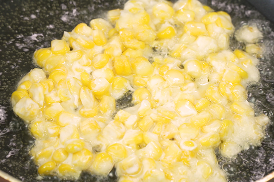 4、玉米粒呈饼状后可在锅中加入倒出的热油,没过玉米粒为佳。