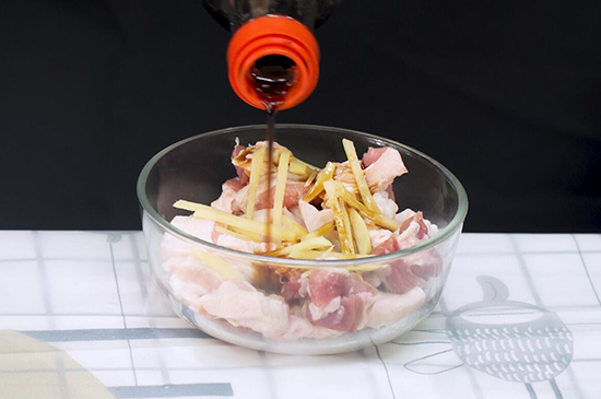1、将五花肉洗净,切成块状放在碗中,加入姜丝、生抽和食盐腌制。